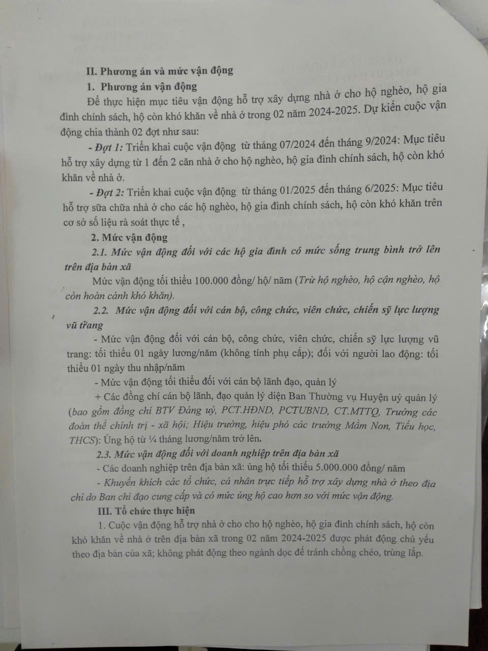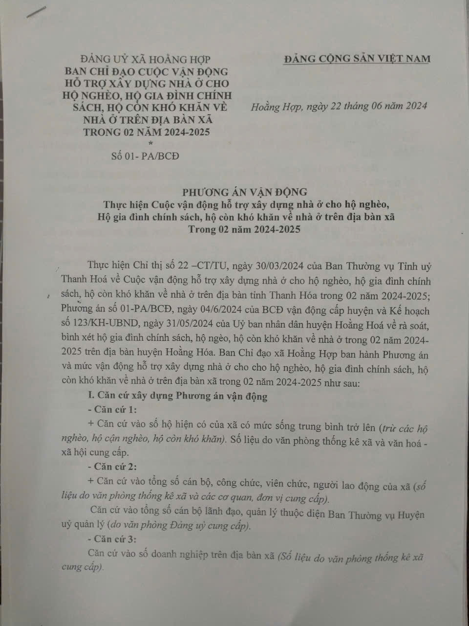 | Trích yếu | PHƯƠNG ÁN VẬN ĐỘNG THỰC HIỆN cvđ HỖ TRỢ XÂY DỰNG NHÀ Ở CHO HỘ NGHÈO, HỘ GIA ĐÌNH CHÍNH SÁCH, HỘ CÒN KHÓ KHĂN VỀ NHÀ Ở TRÊN ĐỊA BÀN XÃ hOẰNG hỢP TRONG 02 NĂM 2024-2025 |